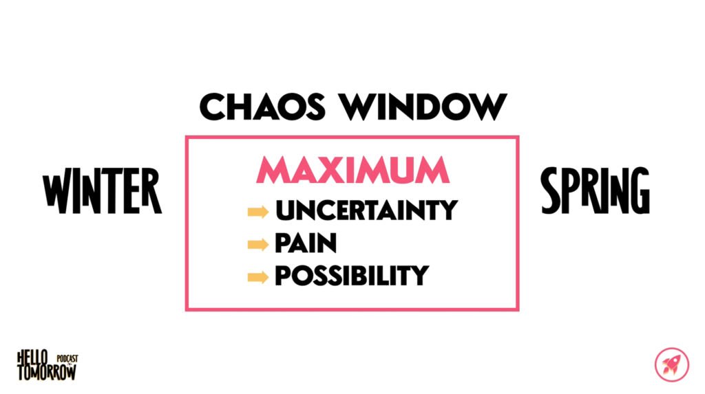 The Chaos Window is the period between when the old system breaks down and when the new system takes hold. It’s the messy, melty transition from Winter to Spring. It’s when society experiences maximum uncertainty, and often, maximum pain.