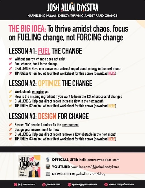 Help more people hear this message! Enjoying this talk? A quick testimonial helps Josh get this message to more amazing people like you! "*" indicates required fields Josh is...*First Name, Organization* Δ FREE RESOURCES "HARNESSING HUMAN ENERGY" PDF DECK Download Josh’s presentation deck (~30MB)! It’s large, but it’s as helpful as it is pretty… DOWNLOAD RECAP & KEY LEARNINGS POSTER A beautiful poster that outlines all the key learning points from this talk. Download it, print it, whatever you like! DOWNLOAD FUTURE DESIGNâ„¢ WHITE PAPER Curious about what Future Designâ„¢ is and how to deploy it more fully in an organization? This is the PDF for you! DOWNLOAD YOU AT YOUR BEST LEADER WORKSHEET Use this worksheet to meet with your direct reports about when they are at their best and build more flow into your team! DOWNLOAD ONGOING LEARNING HELLO TOMORROW PODCAST Get your podcast audio wherever you normally listen to podcasts! LISTEN HELLO TOMORROW YOUTUBE Watch Josh deliver weekly episodes on YouTube! WATCH RESEARCH MCKINSEY FLOW RESEARCH Download this PDF to get the research behind the McKinsey flow statistics shared in Josh’s talk. DOWNLOAD #LOVEWORK META-STUDY Download this PDF to learn more about the #lovework Meta-Study referenced in Josh’s talk. DOWNLOAD HBR/BAIN RESEARCH Download this PDF to get the research behind the HBR/Bain change project statistics shared in Josh’s talk. DOWNLOAD CONTACT JOSH Want to book a keynote, explore a workshop, or bring Future Designâ„¢ into your organization? Drop a note below. If you’ve got something else in mind, just say so — my team and I will get back to you right away. "*" indicates required fields X/TwitterThis field is for validation purposes and should be left unchanged.This field is hidden when viewing the formNext Steps: Sync an Email Add-OnTo get the most out of your form, we suggest that you sync this form with an email add-on. To learn more about your email add-on options, visit the following page (https://www.gravityforms.com/the-8-best-email-plugins-for-wordpress-in-2020/). Important: Delete this tip before you publish the form.How can Josh help your organization?How can Josh help your organization?* Inspire a more future-ready workplace with a custom KEYNOTE Apply and scale Future Designâ„¢ through a hands-on WORKSHOP I have a MEDIA REQUEST or PODCAST I want Josh for Something else Sure! What can Josh do for you?About You & Your OrganizationYour Name* First Last Organization Name (Optional)Your Title (Optional)Mobile PhoneEmail* About Your EventEvent Date*If you're not sure yet, just put your best guess!Event City*Format* In-Person Virtual Hybrid How did you hear about Josh?*LinkedInWeb searchOtherOK! Where did you learn about Josh?Anything else you want Josh to know? (Optional) Δ